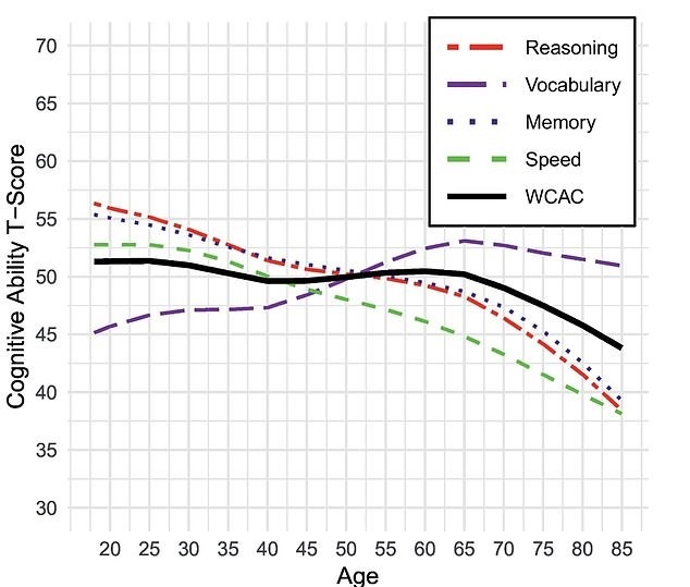 همان طو که گفتیم عملکرد کلی ذهنی بین ۵۵ تا ۶۰ سالگی به اوج خود می سد و از حدود ۶۵ سالگی به بعد کم می شود. این کاهش پس از ۷۵ سالگی بارزتر شد که نشان میدهد کم شدن عملکرد در سنین بالا، پس از شروع میتواند شتاب بگیرد.