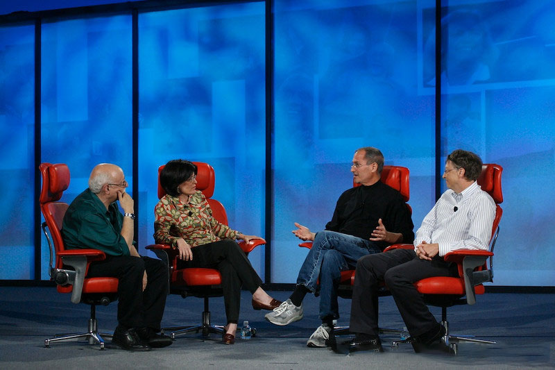از سال ۲۰۰۰ به بعد، باوجود ادامهی رقابت مایکروسافت و اپل رابطهی شخصی گیتس و جابز آرامتر و حتی دوستانهتر شد. آن دو در سال ۲۰۰۷ در کنفرانسی مشترک در کالیفرنیا شرکت کردند و بعد از سالها دوستانه در کنار هم روی صحنه ظاهر شدند. آنها در طول صحبتهایشان از یکدیگر تمجید کردند و رقابتهای گذشته را با طنز و شوخی به یاد آوردند.