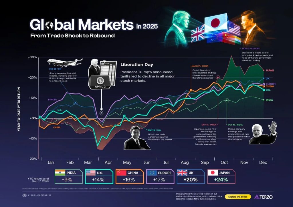بر اساس گزارش رویترز، شاخص سهام جهانی پس از افت ناشی از اعمال تعرفههای موسوم به «روز آزادی» در ماه آوریل، بار دیگر مسیر صعودی خود را بازیافت و با ثبت رشد دو رقمی برای ششمین بار در هفت سال اخیر، حدود ۲۰ درصد افزایش یافت. با این حال، نگاهی دقیقتر به سایر بازارها نشان میدهد که شگفتیهای واقعی در جای دیگری رخ دادهاند.