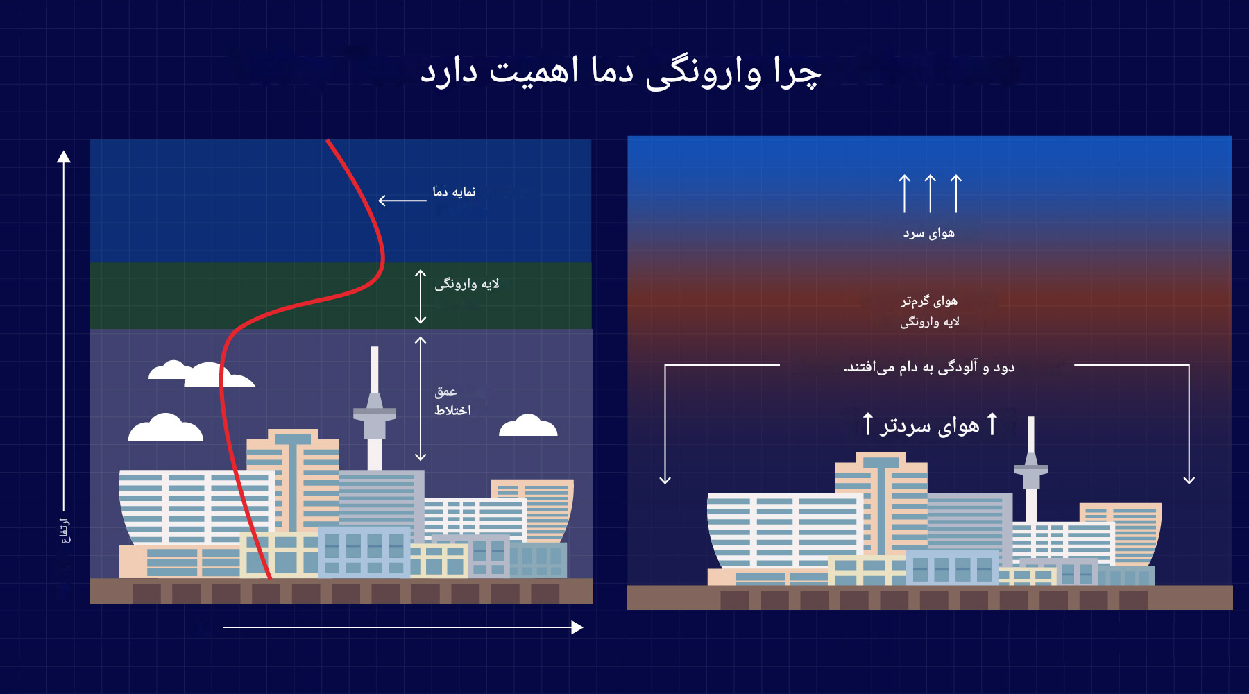 اما در هنگام وقوع وارونگی دما، این تعادل برهم می‌خورد؛ هوای در ارتفاعات بالاتر از سطح زمین گرم‌تر می‌شود و مانند “لحافی ضخیم و خاکستری” روی شهر را می‌پوشاند. این لایه گرم مانند یک سد عمل کرده و مانع از حرکت رو به بالای آلاینده‌ها می‌شود. اگر در روزهای وارونگی از یک محدوده مرتفع خارج شوید، می‌توانید مرز بالایی لایه‌ی آلودگی را به صورت یک خط صاف و مشخص، که هوای زیر آن آلوده و هوای بالای آن تمیز است، به‌وضوح تشخیص دهید.