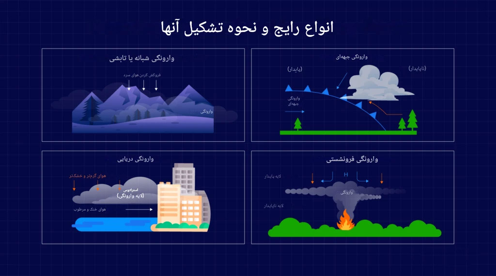 وارونگی دما دو نوع اصلی دارد که در لایه‌های مختلف جو شکل می‌گیرند: