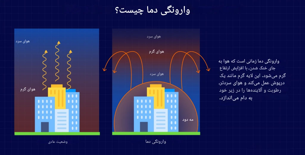پدیده وارونگی دما (Temperature Inversion) یک وضعیت نامطلوب جوی است که در فصول سرد و پایدار، به‌ویژه در شهرهای بزرگ، به وضوح مشاهده می‌شود. در این وضعیت، نظم طبیعی اتمسفر برهم خورده و برخلاف حالت معمول، یک لایه‌ی هوای سرد و سنگین در نزدیکی سطح زمین زیر یک لایه‌ی هوای گرم و سبک محبوس می‌گردد. پیامد مستقیم این پایداری، حبس و انباشت شدید آلاینده‌های تولیدشده توسط ترافیک، صنایع و سایر منابع در ارتفاعات پایین است که کیفیت هوا را به سطوح ناسالم و بسیار ناسالم کاهش می‌دهد که باعث آلودگی هوا شده و به‌طور مستقیم، سلامت شهروندان را، خصوصاً مبتلایان به بیماری‌های قلبی و تنفسی، به خطر می‌اندازد.