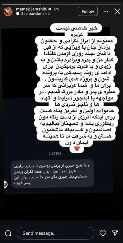 در این بین، مامک جمشیدی، خواهر پژمان جمشیدی نیز استوری جدیدی درباره سفر برادرش به کانادا منتشر کرده است.