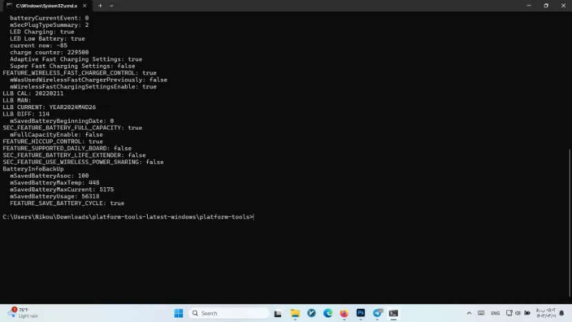 - در نهایت، برای دریافت اطلاعات باتری، دستور زیر را وارد کرده و Enter را فشار دهید: adb shell dumpsys battery