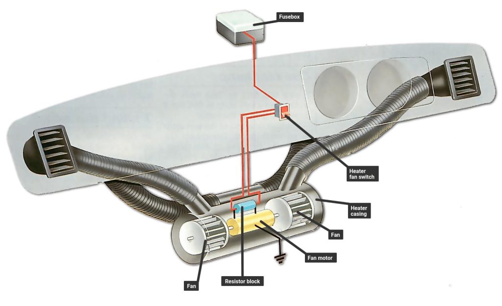 فن وظیفه دارد هوای گرم تولیدشده را به داخل کابین هدایت کند. اگر موتور فن بسوزد یا سیستم برق‌رسانی آن دچار مشکل شود، حتی در صورت گرم بودن آب موتور، هوای گرمی وارد اتاق خودرو نخواهد شد. معمولاً در این شرایط، از دریچه‌های تهویه هیچ بادی خارج نمی‌شود یا شدت آن بسیار کم است.