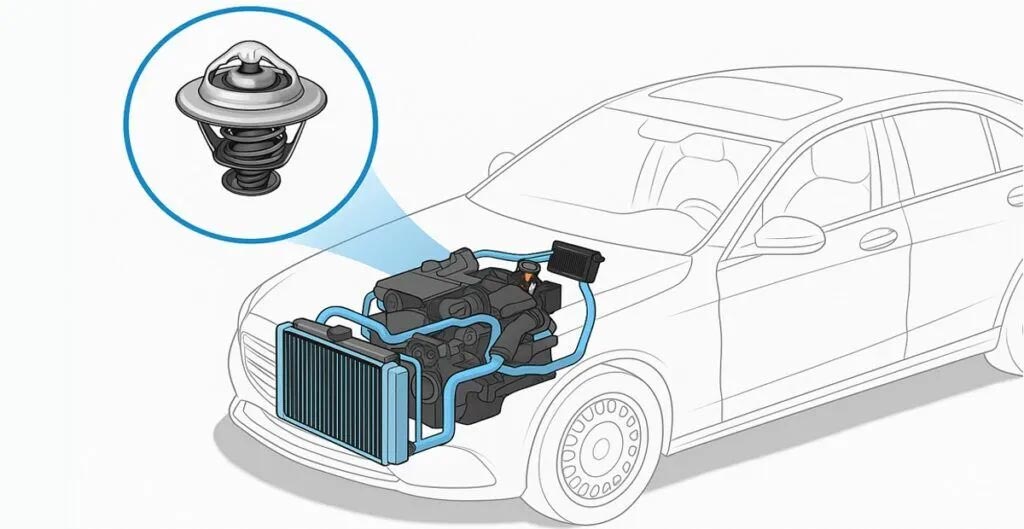 ترموستات با کنترل دمای موتور، زمان گردش آب به سمت رادیاتور را تنظیم می‌کند. اگر ترموستات در حالت باز گیر کند، موتور دیر گرم می‌شود و دمای آب به حد لازم برای گرم کردن کابین نمی‌رسد. در چنین شرایطی، بخاری حتی پس از طی مسافت طولانی هم باد ولرم یا سرد تولید می‌کند.